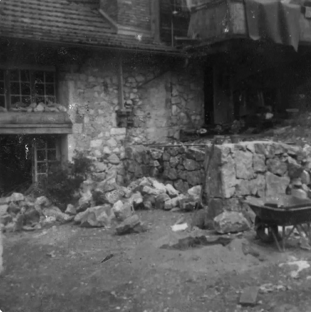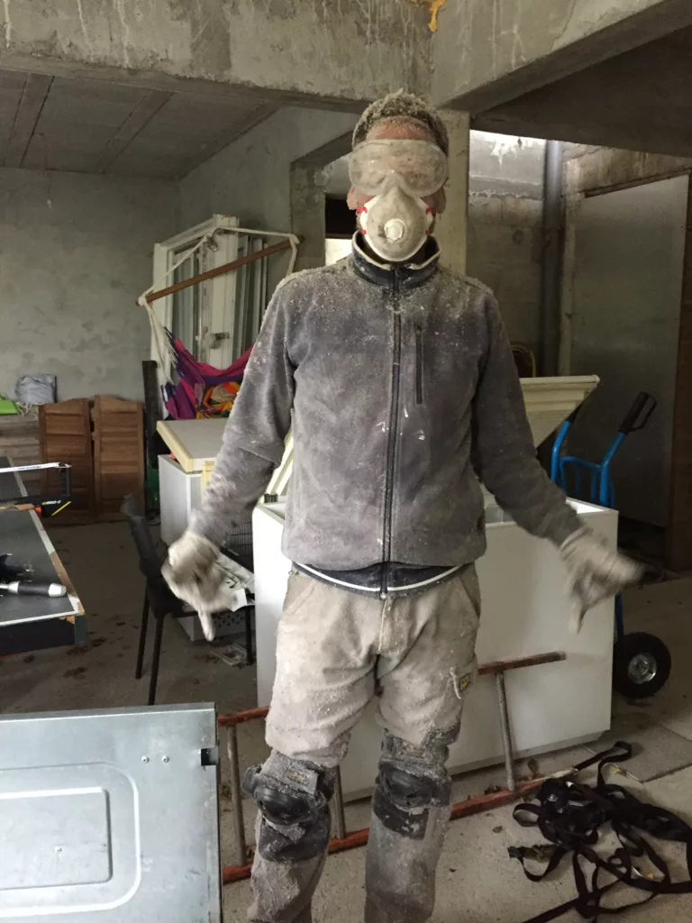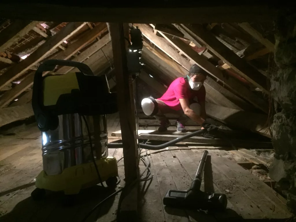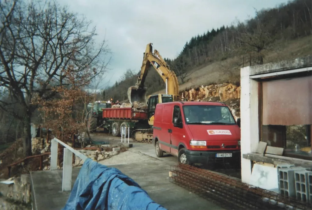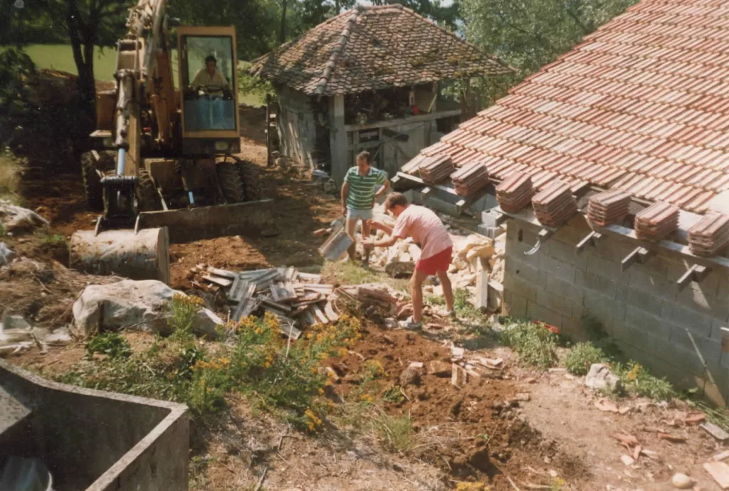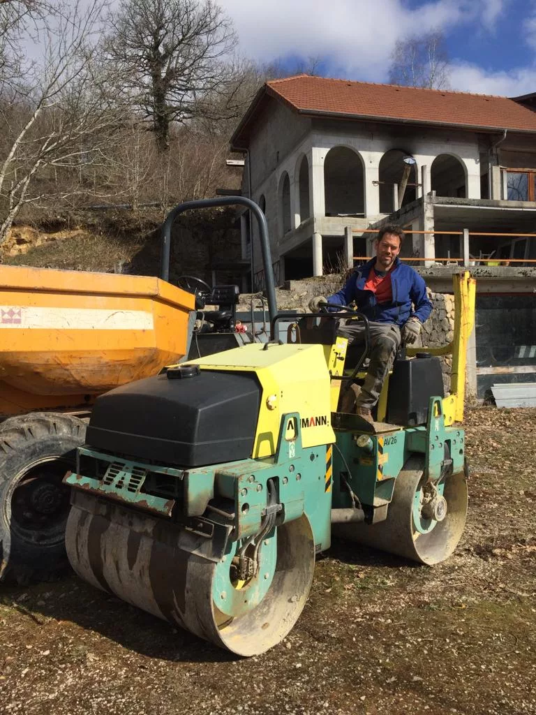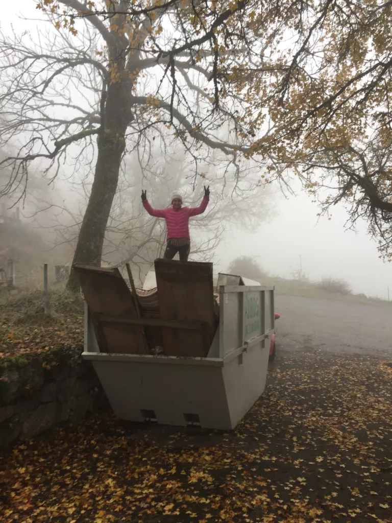 Grâce à la plus-value réalisée par la vente de notre logement, nous avons pour projet de créer ici à la fois notre nouveau chez-nous et un gîte en gestion libre de 15 personnes. Nous attaquons donc le tri et le vidage de la maison, tout en missionnant des artisans pour de gros travaux : terrassement, drainage du bâtit, création de parking, consolidation des terrasses et finition de la toiture.