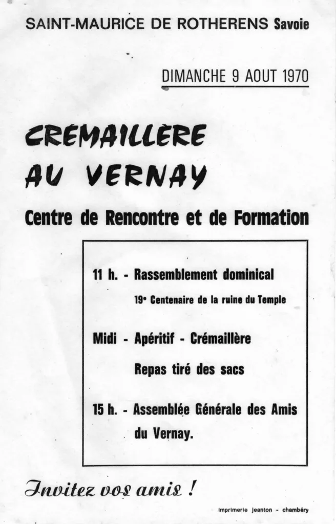 À l’été 1970, une crémaillère marque officiellement la naissance du Vernay. Un lieu de rencontres, de formations, de partages. Une association naît : les Amis du Vernay.